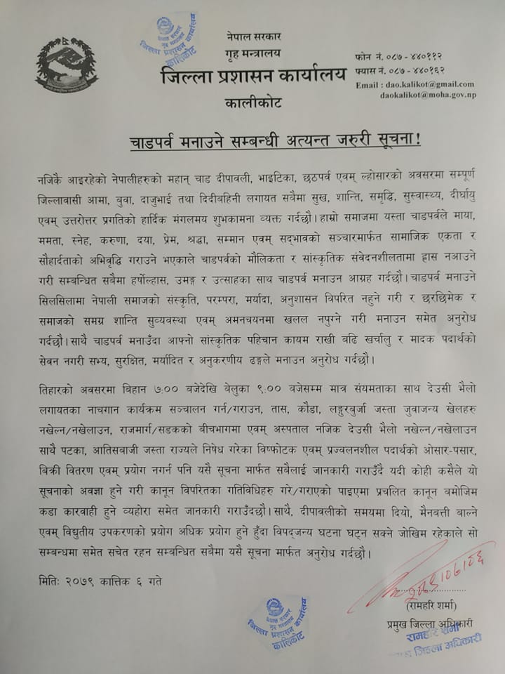 २२ कात्तिकमा कालिकोट आउँदै प्रचण्ड कर्णालीको किनारमा तीन जिल्लाका सुरक्षा निकायका प्रमुखहरुको बैठक अवरुद्ध कर्णाली करिडोरको पहिरो पन्छाउन सुरु कालीकोटमा बेलुका ९ बजेसम्म मात्रै देउसी–भैलो खेल्न पाइन उमेर पुगेर विवाह गर्ने दलित समुदायका महिलालाई १० हजार नगद दिने बढ्यो खानेपानीको समस्या,अझै एक महिना लाग्ने अखिल नेपाल राष्ट्रिय स्वतन्त्र बिद्यार्थी यूनियन द्धारा शुभकामना आदान प्रदान कार्यक्रम सम्पन्न कारागारका कैदिबन्दिलाई कर्णाली जेसिसद्वारा खेलकुद साम्रगी सहयोग असोज ५ गतेदेखि सुरु भएको भलिवल प्रतियोगिमा नहरहरीनाथ प्रथम र दृर्तिय विद्यार्थीको सारथि बन्दै सानिमा बैंक Posts navigation Previous 1 … 54 55 56 57 Next