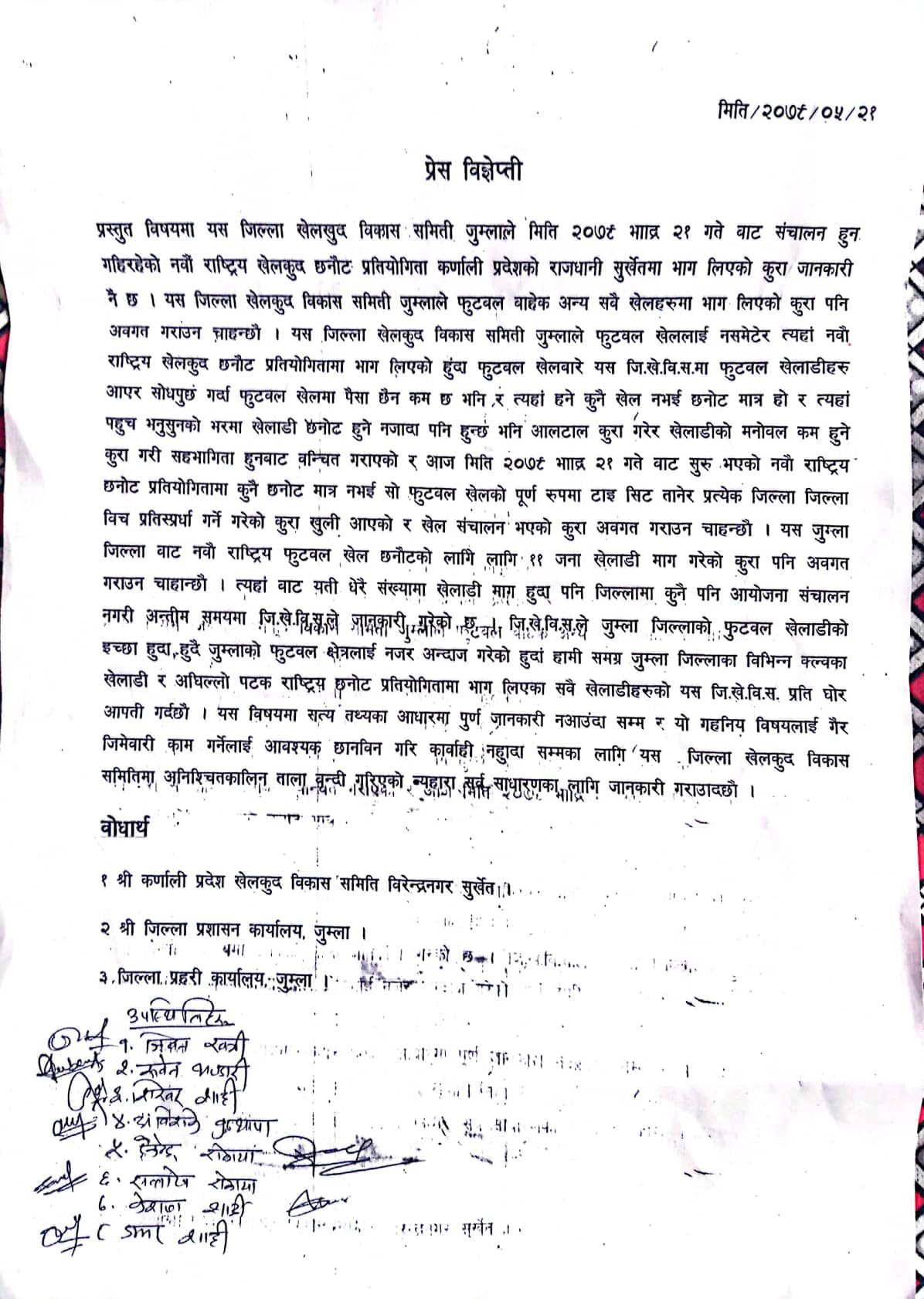 प्रेस विज्ञप्ति जारी गर्दै फुटबल खेलाडी भनेका छन्, ‘जुम्लाबाट फुटबल बाहेक अरू सबै खेलका प्रतियोगितामा खेलाडी सहभागी गराएका छन्।