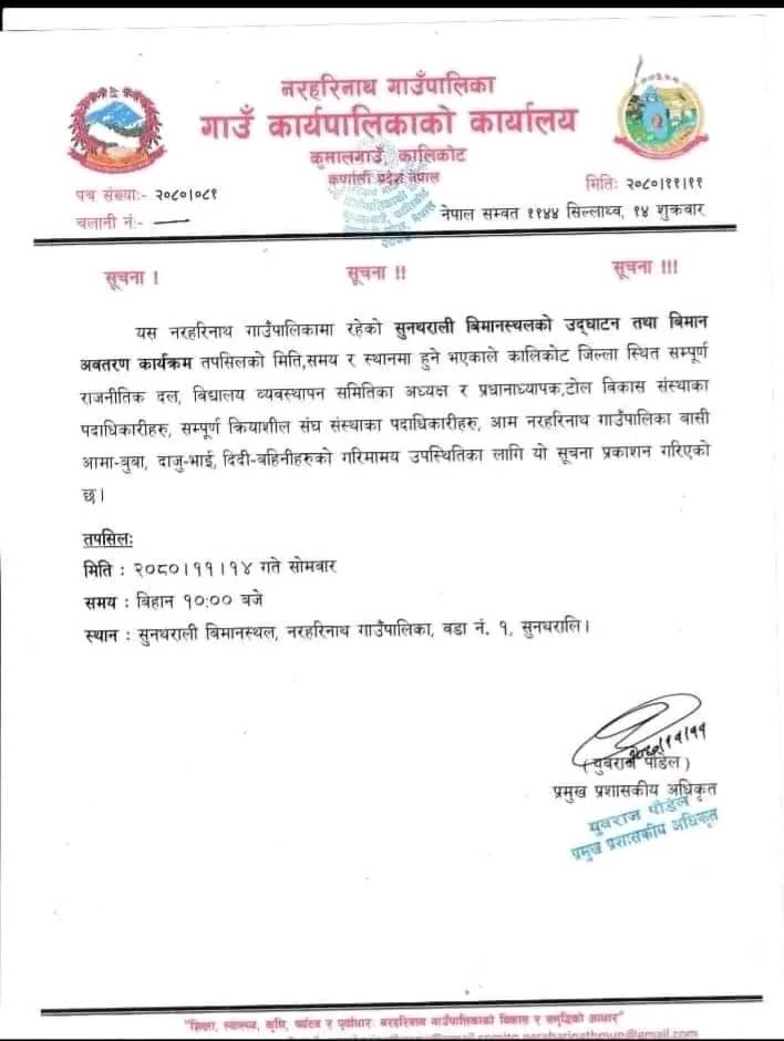 कालीकोटको सुनथराली विमानस्थलको फागुन १४ गते उद्घाटन हुने भएको छ। झन्डै ३८ वर्षदेखि निर्माणाधीन अवस्थामा रहेको कालीकोटको एक मात्र सुनथराली विमानस्थल २०७९ साल माघ ११ गते निर्माण पूरा भएको थियो । निर्माण पूरा भएको डेढ वर्षपछि तिन पटकको मितिले भाका नाघे पनि अब नयाँ मिति फागुन १४ जुरेको नरहरिनाथ गाउँपालिकाका प्रबक्ता प्रदिप बोहोराले बताए । यसका लागि नागरिक उड्डयन प्राधिकरणले नरहरिनाथ गाउँपालिकाको कार्यालयलाई सूचना पठाइसकेको बताइएको छ ।