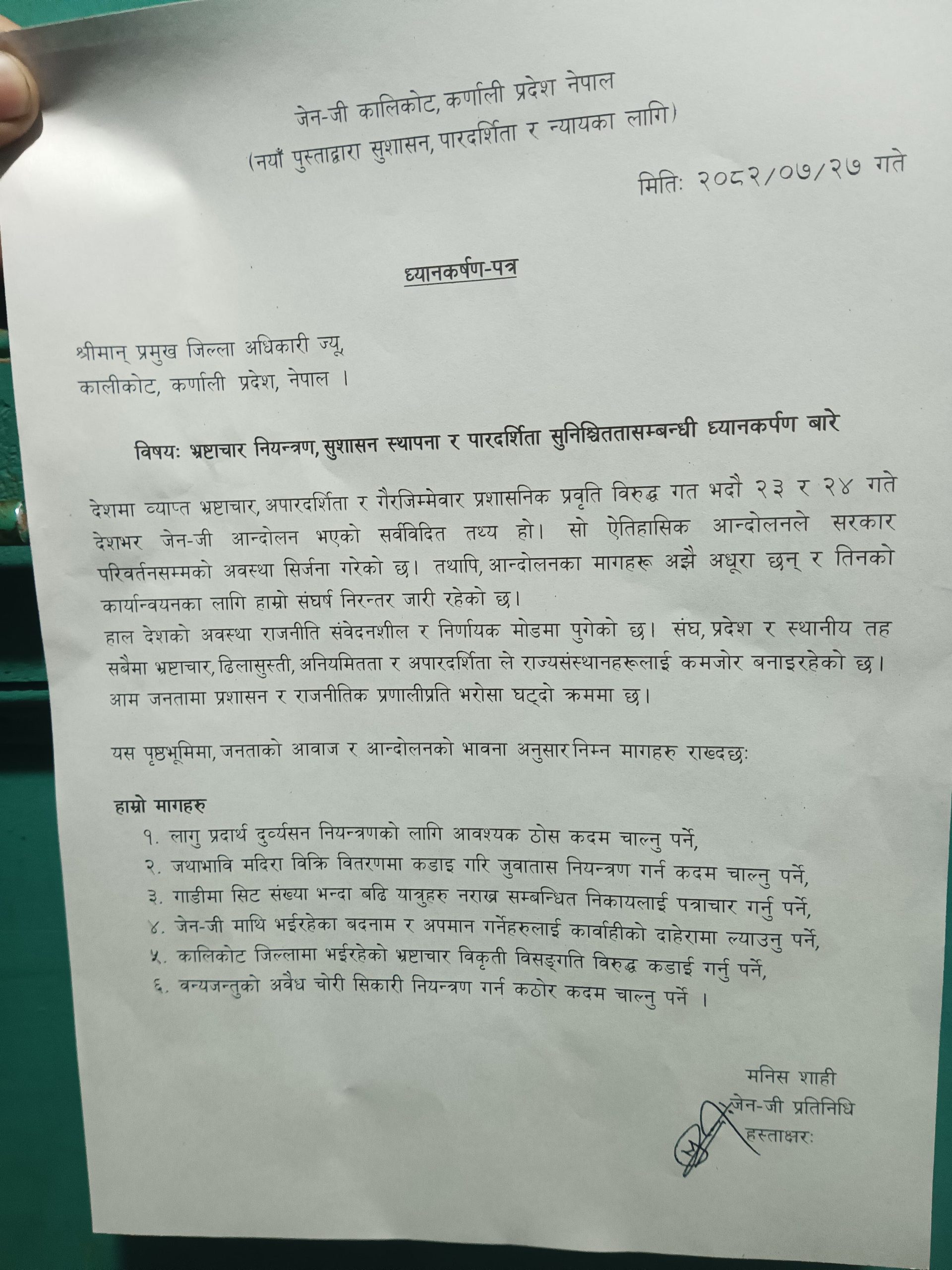 कालिकोट : नयाँ पुस्ताद्वारा सुशासन, पारदर्शिता र न्यायका लागि’ भन्ने नाराका साथ जेन–जी प्रतिनिधि मनिस शाहीकाे नेतृत्वमा प्रमुख जिल्ला अधिकारी गाेकर्ण राज सुयल लाई ध्यानाकर्षण–पत्र बुझाएको हाे । गत भदौ २३ र २४ गते देशभर चलेको जेन–जी आन्दोलनका मागहरू अझै कार्यान्वयन नहुँदा त्यसको निरन्तर दबाबस्वरूप आज प्रमुख जिल्ला अधिकारी लाई ध्यानाकर्षण–पत्र बुझाइएका हुन।