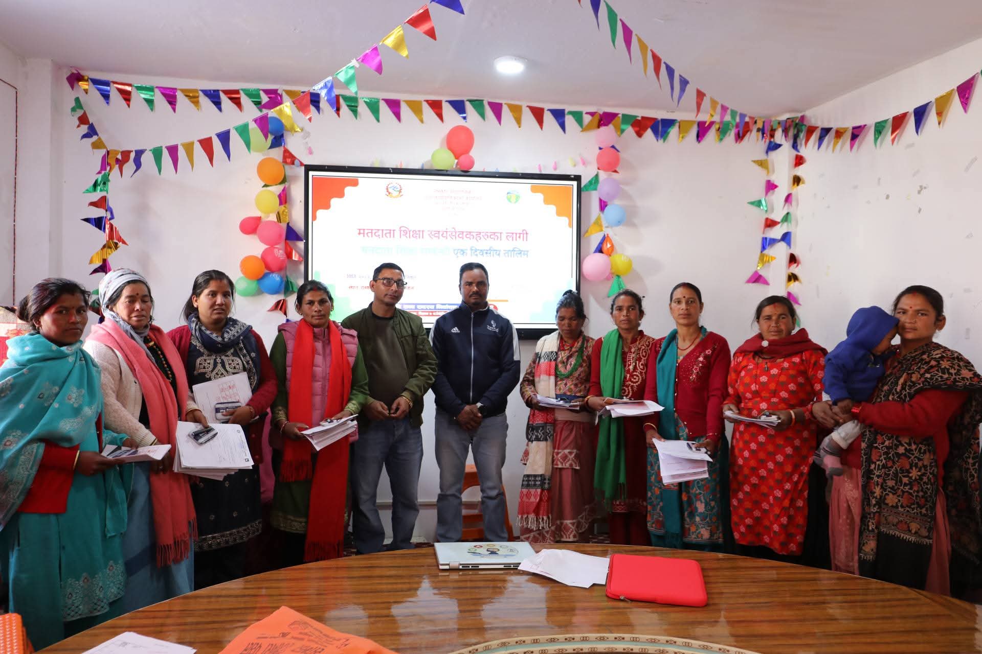कार्यक्रमको सहजीकरण निमित्त प्रमुख प्रशासकीय अधिकृत खेमराज शाही र मतदाता शिक्षा अनुगमनकर्ता नेत्र राज शाहीले संयुक्त रूपमा गर्नुभएको थियो।तालिमका क्रममा मतदान प्रक्रिया, प्रत्यक्ष तथा समानुपातिक मतपत्र प्रयोग विधि, मत बदर हुने अवस्था तथा त्यसबाट जोगिने उपाय निर्वाचन आचारसंहिता र मतदान केन्द्र व्यवस्थापन सम्बन्धी विषयमा विस्तृत जानकारी प्रदान गरिएको बताएको छ ।